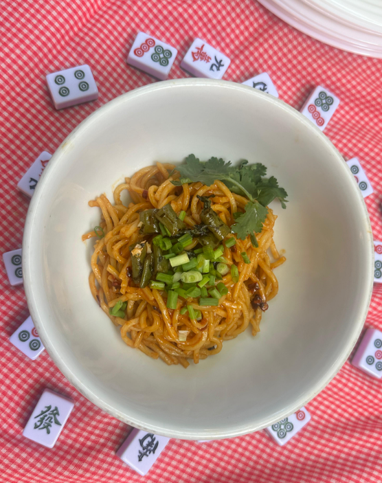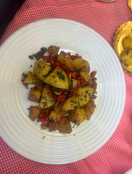 Sementara para pemain fokus menyusun mahjong di meja, anggota kelompok lainnya harus melakukan side quest yaitu memasak makanan khas Tiongkok. Kelas kami, XIIE, memilih untuk memasak Regan Mian sebagai main course dan Enshi Baked Potatoes sebagai side dish. Regan Mian adalah mie kering khas Hubei yang disajikan dengan saus wijen kental, kecap asin, cuka, dan bawang putih. Teksturnya lembut dengan rasa gurih dan sedikit pedas. Enshi Baked Potatoes adalah kentang panggang asal Hubei yang dibumbui dengan cabai, bawang putih, dan lada yang menghasilkan aroma sedap dan cita rasa yang pedas gurih yang khas. Kami membagi tugas agar dapat selesai tepat waktu. Ada kelompok yang membuat main course yaitu Regan Mian, ada kelompok yang membuat side dish yaitu Enshi Baked Potatoes, dan ada kelompok yang bertugas untuk mendekor stand yang pada akhirnya stand tersebut akan dikunjungi oleh siswa lain ataupun para guru untuk mencicipi hidangan dan menilai hidangan kami. Kami semua sangat antusias dalam membuat hidangan dan menata hidangan dengan rapi. Meskipun kami belum pernah dan belum terbiasa memasak hidangan ini. Namun, semua tetap berusaha membuat dan mengusahakan untuk hasil yang terbaik.